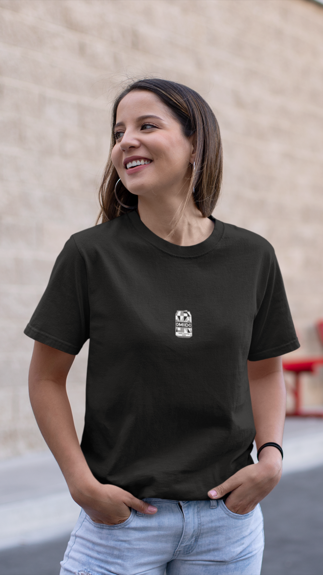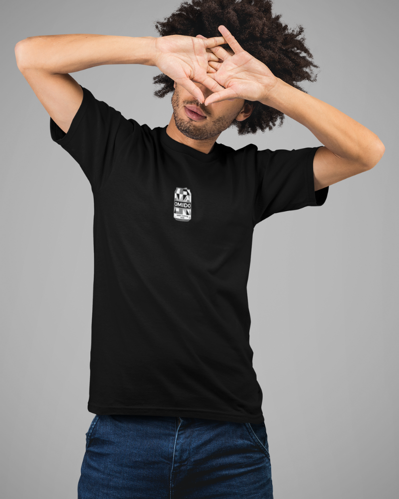 Cleanes Shirt mit einem kleinen Augenzwinkern: vorne eine frische OMIDO-Dose, hinten die zerdrückte Version – schade um den Pfand, aber stylisch ist’s allemal.